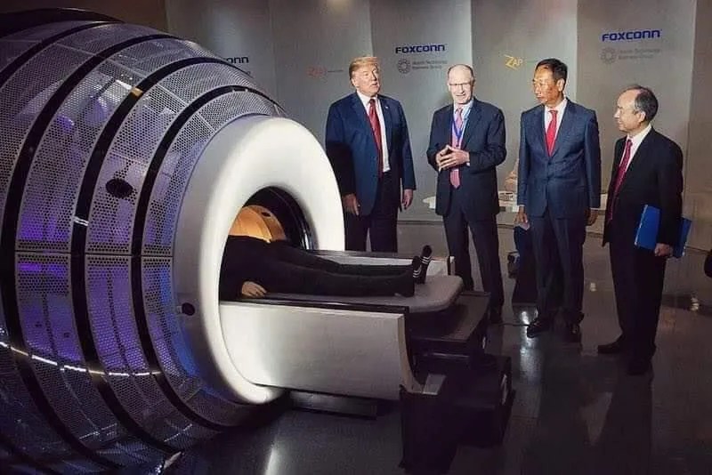 In quella che segue si vede il presidente Trump insieme a Terry Goude, direttore del gruppo dell’industria elettronica taiwanese Foxconn, mentre discutono davanti ad uno di questi letti medici.