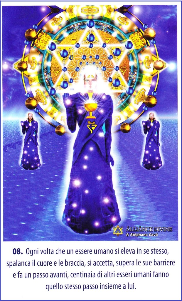 Questa è l’unica carta del mazzo ad essere parzialmente figurativa, ma questo non ha a che vedere con il motivo per cui la propongo, lo faccio perché mi sembra particolarmente importante tenere presente il messaggio di cui è portatrice, in questo tempo in cui stiamo transitando da una dimensione ad una più elevata. Il messaggio è espresso dalle parole che accompagnano la grafica ed è che l’elevazione del singolo costituisce contemporaneamente un’elevazione dell’umanità dal momento che siamo tutti connessi, che apparteniamo tutti ad un unico campo di coscienza.