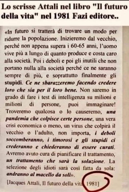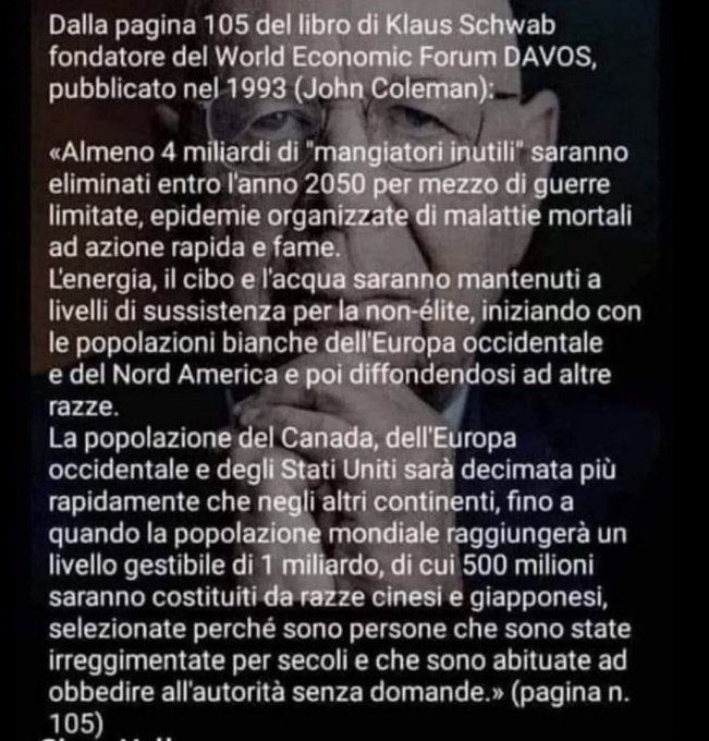 In sostanza quello che importa far notare qui è come la scusa del cambiamento climatico, con tutte le restrizioni che vogliono infliggerci ed hanno già annunciato, sia in realtà funzionale alla realizzazione dell’agenda 2030 di Davos, che prevede la depopolazione del pianeta ed il controllo della popolazione rimanente tramite microchips impiantati nel corpo.