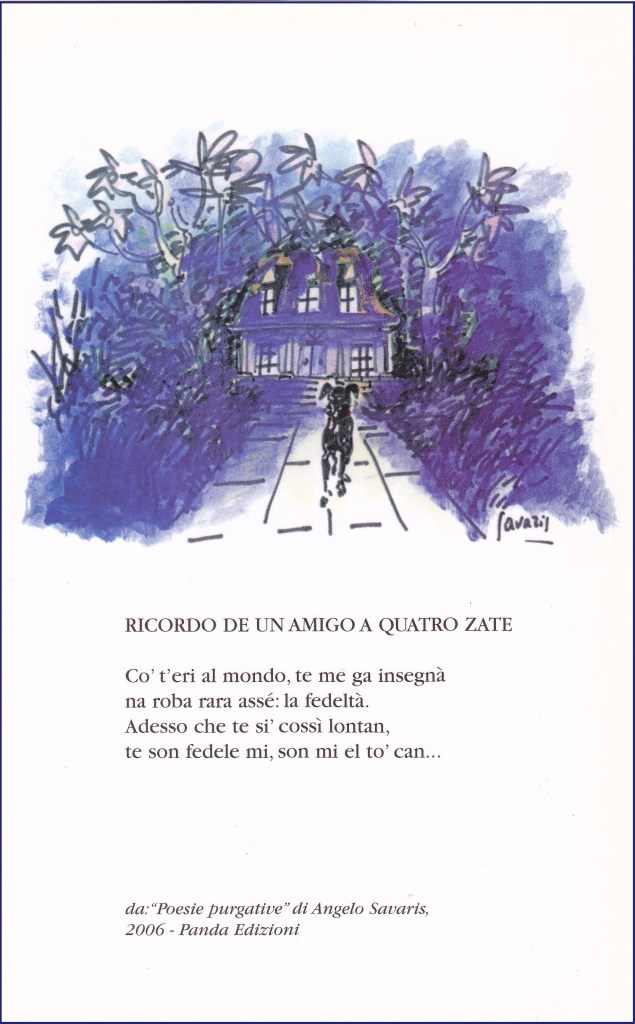 Angelo Savaris è un poeta dialettale rodigino. Condivido questa sua breve poesia perché, secondo il mio sentire, esprime molto bene la sensazione di struggente nostalgia che si prova nel ricordare un animale amato che non c’è più.