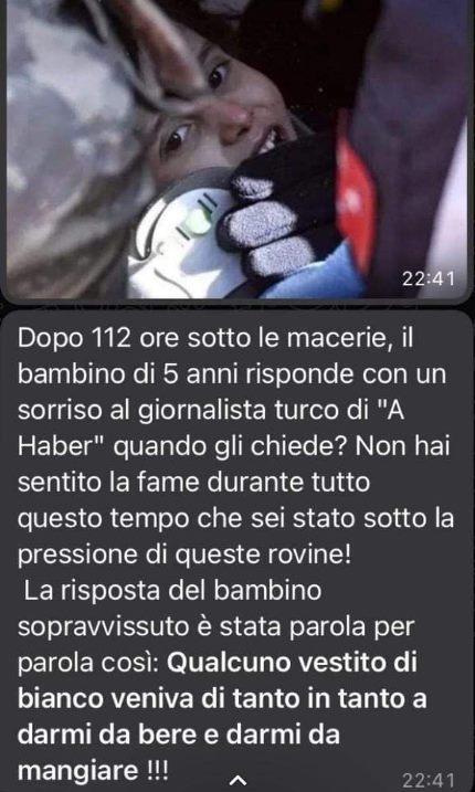 Si tratterà forse di ologrammi, dell’effetto degli stupefacenti che è in uso dare ai soldati che devono combattere perché possano commettere quelle atrocità che vengono loro ordinate, si tratta forse di tecnologie per la manipolazione mentale o si tratta davvero di entità non terrene? Nell’eventualità si trattasse di quest’ultima ipotesi, pare vi sia un precedente piuttosto recente: risale infatti al momento del sisma in Turchia. La notizia è stata pubblicata dal giornalista Maurizio Blondet nel suo blog il giorno 15 febbraio 2023. Se il bimbo era sepolto nelle macerie, come poteva un umano andare a rifocillarlo?