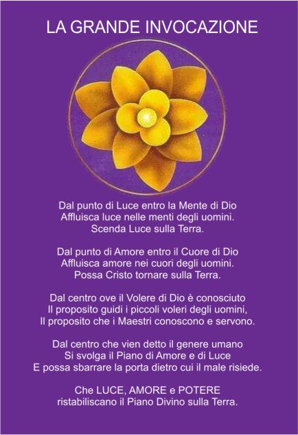 Ogni religione ha le sue preghiere e chi si sente chiamato da questo strumento può utilizzare quelle appartenenti alla sua confessione. Chi non si riconosce in nessun culto può usare parole proprie, o volendo, può utilizzare una preghiera che non appartiene a nessuna religione, ma all’umanità intera, e che è stata data ad Alice A. Bailey da un maestro della Gerarchia Planetaria, conosciuto come il Tibetano, nel 1945, al termine della seconda guerra mondiale, nell’ambito di un messaggio rivolto a tutti gli uomini di buona volontà. Si chiama ‘La grande invocazione’, è conosciuta in tutto il mondo ed è stata tradotta in 80 lingue e dialetti.